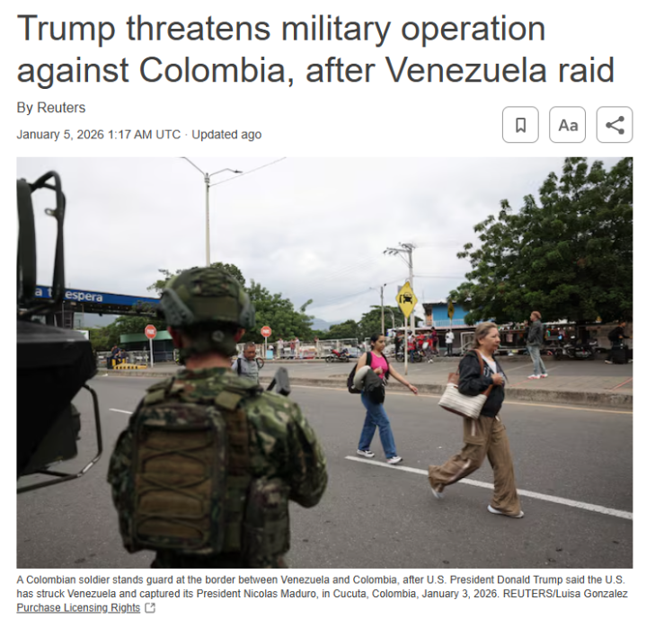 路透社报道:在突袭委内瑞拉后,特朗普威胁对哥伦比亚采取军事行动