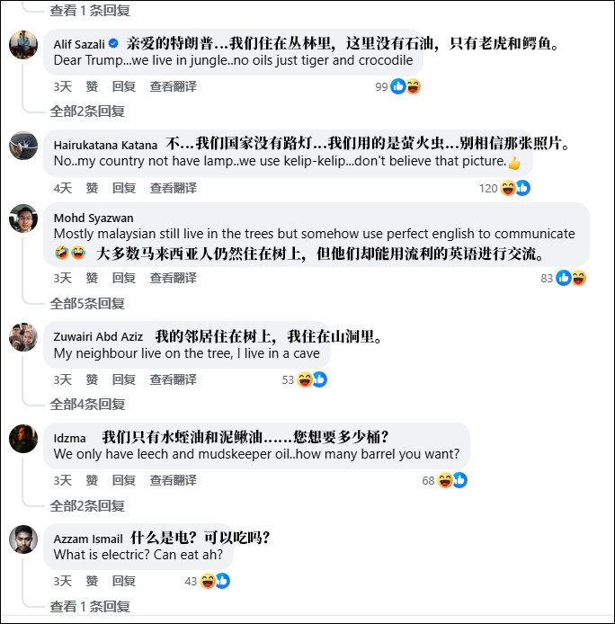 几个小时内,帖文评论区就掀起了一场“风暴”,数百名马来西亚网民以讽刺的口吻称,自己的国家“太过穷乡僻壤”、“太过阴森恐怖”、“缺乏石油资源,只有棕榈油”,想以此证明马来西亚没有任何“战略意义”。