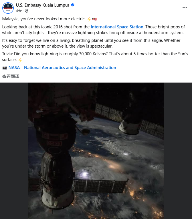 “上周的马来西亚上空闪电照让我们再次感受到了大自然的力量,但真正的力量在于我们的合作。”在后来的一则帖文中,美国大使馆提到,马来西亚签署了美国主导的《阿尔忒弥斯协议》,正在下一代太空探索中发挥关键作用。