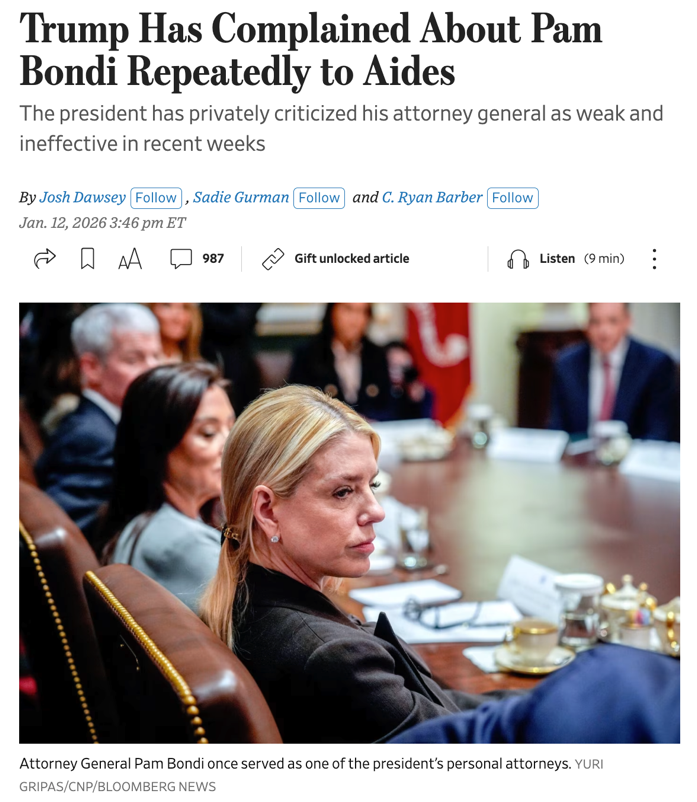 △《华尔街日报》报道,特朗普向助手抱怨司法部长邦迪工作不力