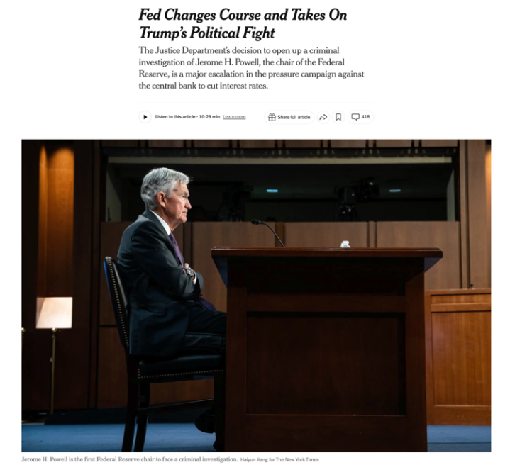 △《纽约时报》报道,司法部的调查举动,标志着向联储施压要求其大幅降低利率