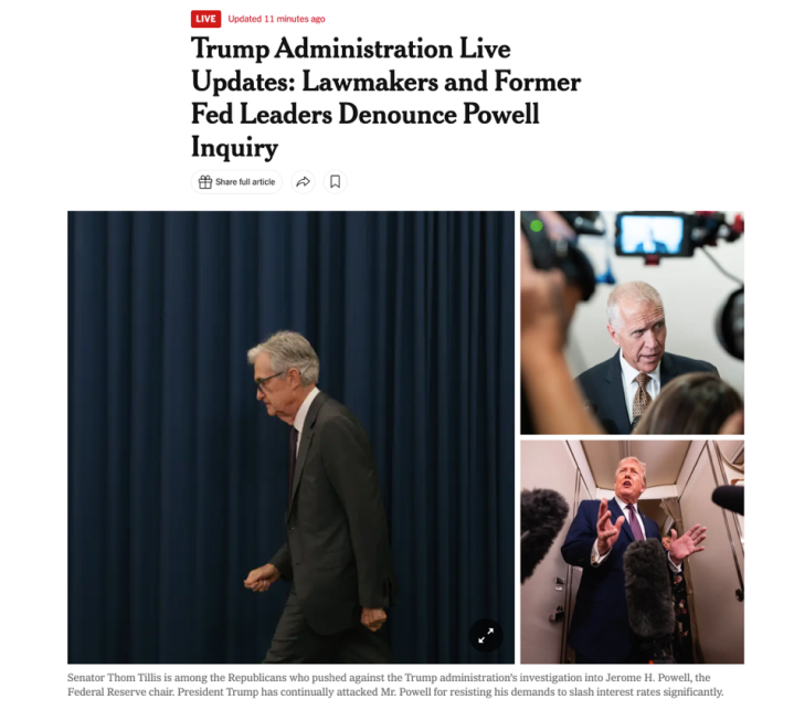 美国多家媒体认为,这是特朗普政府与鲍威尔长期冲突(尤其围绕降息节奏与幅度)的一次“明显升级”。舆论分析认为,这场冲突之所以迅速扩散,不在于工程审计有多复杂,而在于“传票+刑事威胁”的组合,将原本属于国会监督与工程审计范畴的问题,推到了可能影响央行决策的政治高压线上——在利率、通胀与选民情绪都高度敏感的当下,这一信号足以放大一切解读。