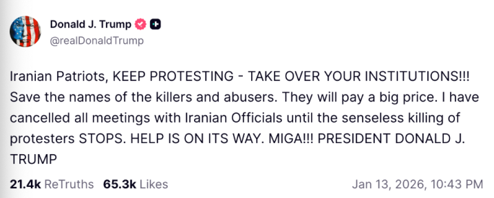 此前,特朗普曾表示,伊朗方面已与美国政府官员接触并提议进行谈判,“会议正在安排中”。同时,美国正在考虑应对伊朗局势的一系列措施,包括军事行动等“一些非常强硬的选项”。但根据特朗普的最新表态,这些会面均已取消。