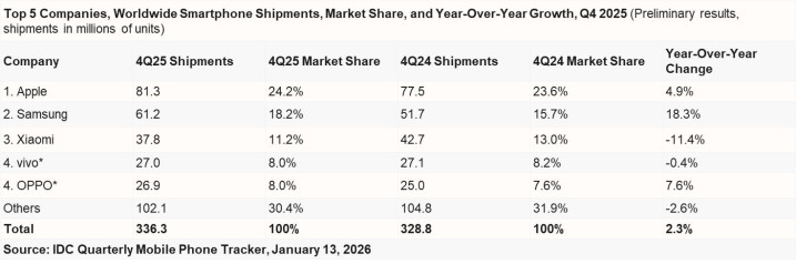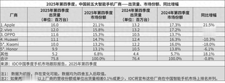 1月14日,国际数据公司IDC发布2025年全球智能手机市场跟踪报告,2025年全球智能手机总出货量累积12.6亿部,同比增长1.9%,智能手机市场延续复苏态势。第四季度受高端手机的持续增长以及消费者预期价格上涨的积极影响,出货量达3.363亿部,同比增长2.3%。