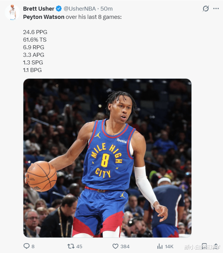 没有约基奇的八场比赛,四年级的沃特森场均37.4分钟,拿到24.6分6.9篮板3.3助攻1.3抢断1.1盖帽,命中率51.1%,三分命中率44.2%,这八场比赛他合计在场+18排名第二,沃特森太出色了。