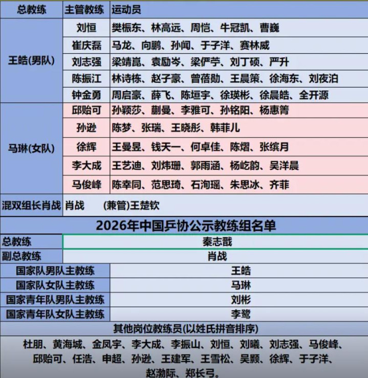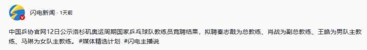 【1】2026年1月12日发布 闪电新闻《中国乒协官网12日公示洛杉矶奥运周期国家乒乓球队教练员竞聘结果,拟聘秦志戬为总教练、肖战为副总教练、王皓为男队主教练、马琳为女队主教练。#媒体精选计划 #闪电主播说》