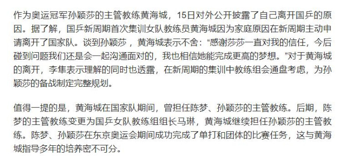 不过目前孙颖莎与邱贻可合作稳定,黄海城大概率会深耕新生代培养,为女队储备后备力量,至于最终分工,还需等官方敲定。