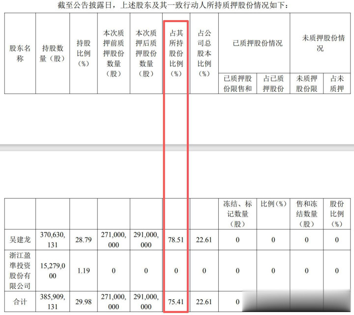 除了减持外,吴建龙还通过高比例质押其持有的向日葵股权,以获得现金流。数据显示,在吴建龙2023年增持后,吴建龙及其一致行动人的股权质押比例迅速攀升。截止2025年9月,吴建龙所持有的向日葵57.27%的股权已处于质押状态,最高时,其估值质押比例甚至超过了75%。