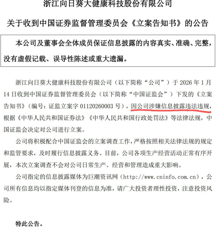 1月15日,一纸公告,让向日葵(300111.SZ)的股价开盘即遭遇20CM的跌停。前一晚,公司发布公告确认,因在重大资产重组中涉嫌误导性陈述,中国证监会决定对企业立案调查;同日,公司宣布终止了这项筹划四个多月的跨界并购。