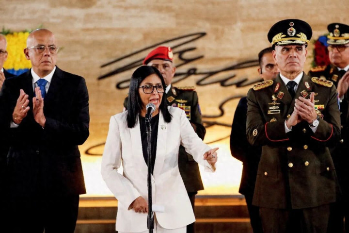 1月8日,委内瑞拉加拉加斯,代总统德尔西·罗德里格斯(中)在英雄烈士晋升及授勋仪式上发表讲话,悼念在美方绑架马杜罗夫妇事件中牺牲的委内瑞拉和古巴军警人员。左为全国代表大会主席豪尔赫·罗德里格斯,右为国防部长洛佩斯。