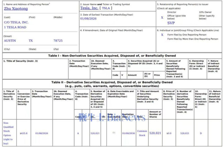 根据昨天公布的一份新的美国证券交易委员会文件,朱某获得了520,021份股票期权,行权价格为435.80美元。授予日期为2026年1月8日。