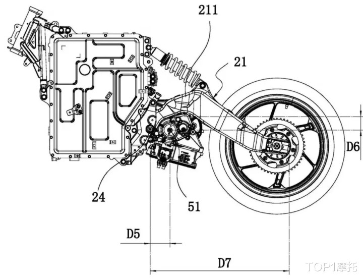 在春风的专利打算中,电机的位置尤其靠后(位于后摇臂枢轴之后),后摇臂朝上周折并掩饰在电机上方,以幸免增多后摇臂的宽度和长度。不外也因此莫得空间容纳多连杆吊挂,而聘请了直连的后减震器。
