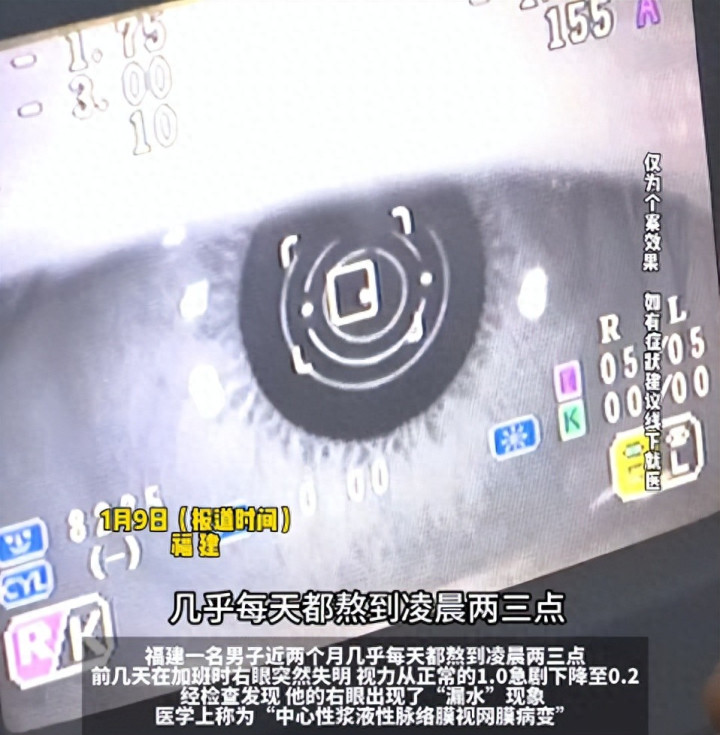 福建一名男子的经历给所有人敲响警钟:近两个月几乎每天熬到凌晨两三点,前几天加班时右眼突然失明,视力从正常的1.0急剧降到0.2,检查后发现竟是眼睛“漏水”了。