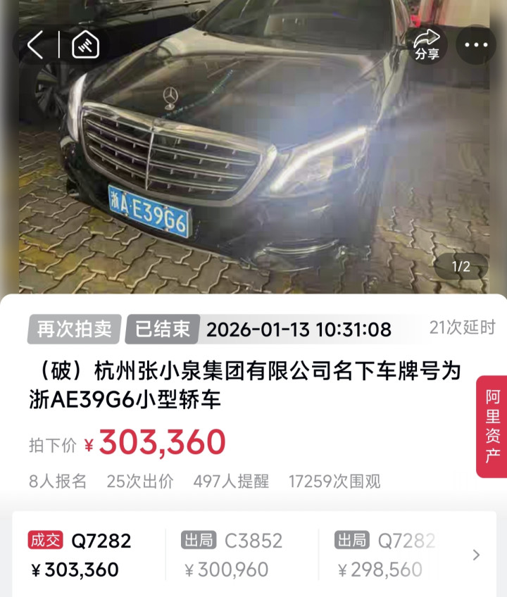 大皖新闻讯1月13日上午,大皖新闻记者从阿里资产平台看到,名为“(破)杭州张小泉集团有限公司名下车牌号为浙AE39G6的小型轿车”的标的,已经成功拍出,拍下价为303360元,这是该车第五次拍卖,前四次均因无人出价而流拍,起拍价也从60万元一直降至24.576万元。