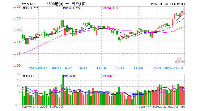 1月13日,截止午间收盘,中证A500增强ETF(159226)涨0.08%,报1.280元,成交额1268.10万元。中证A500增强ETF(159226)重仓股方面,宁德时代截止午盘涨0.24%,贵州茅台跌0.30%,中国平安涨2.03%,招商银行跌0.05%,美的集团跌2.02%,北方华创跌1.32%,凤凰彩票app澜起科技跌1.93%,药明康德涨5.76%,紫金矿业涨3.68%,寒武纪跌5.63%。