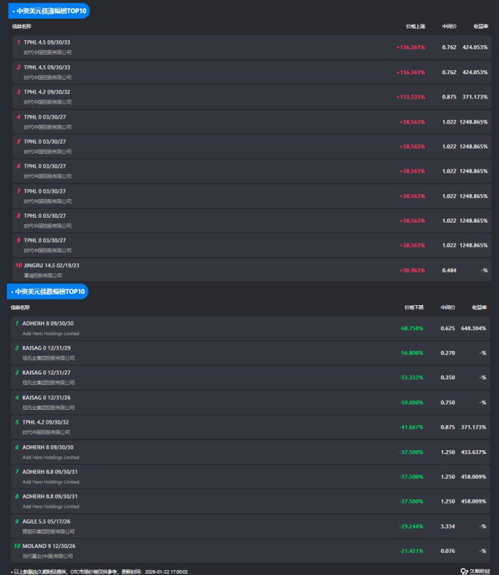 1月22日,中资美元债涨跌幅榜TOP10如下: