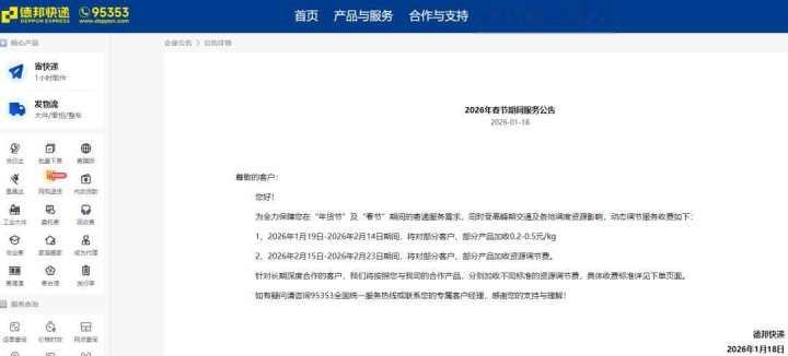 德邦和顺丰一样,采取了分阶段收费的策略。具体而言,2026年1月19日-2026年2月14日期间,将对部分客户、部分产品加收0.2-0.5元/kg;2026年2月15日-2026年2月23日期间,将对部分客户、部分产品加收资源调节费。