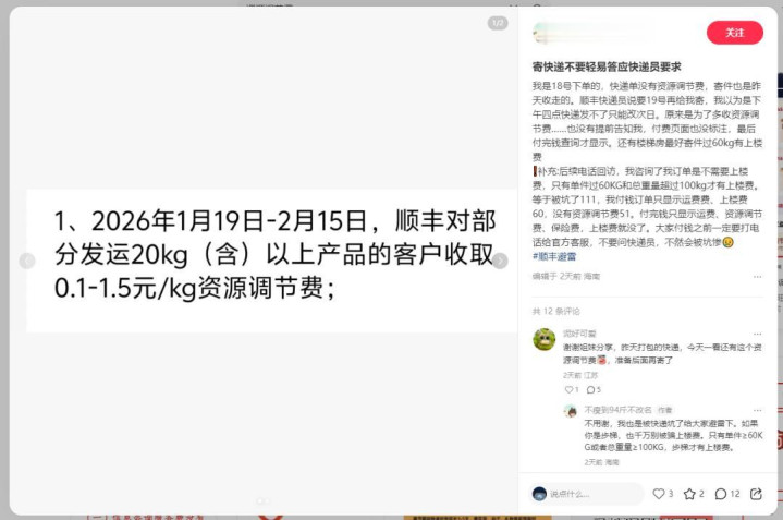 2026年1月16日,顺丰在《2026年春节期间服务公告》中明确表示:2026年1月19日-2月15日,顺丰对部分发运20kg(含)以上产品的客户收取0.1-1.5元/kg资源调节费;2026年2月16日-2月23日春节假期期间,顺丰对寄递服务加收资源调节费。